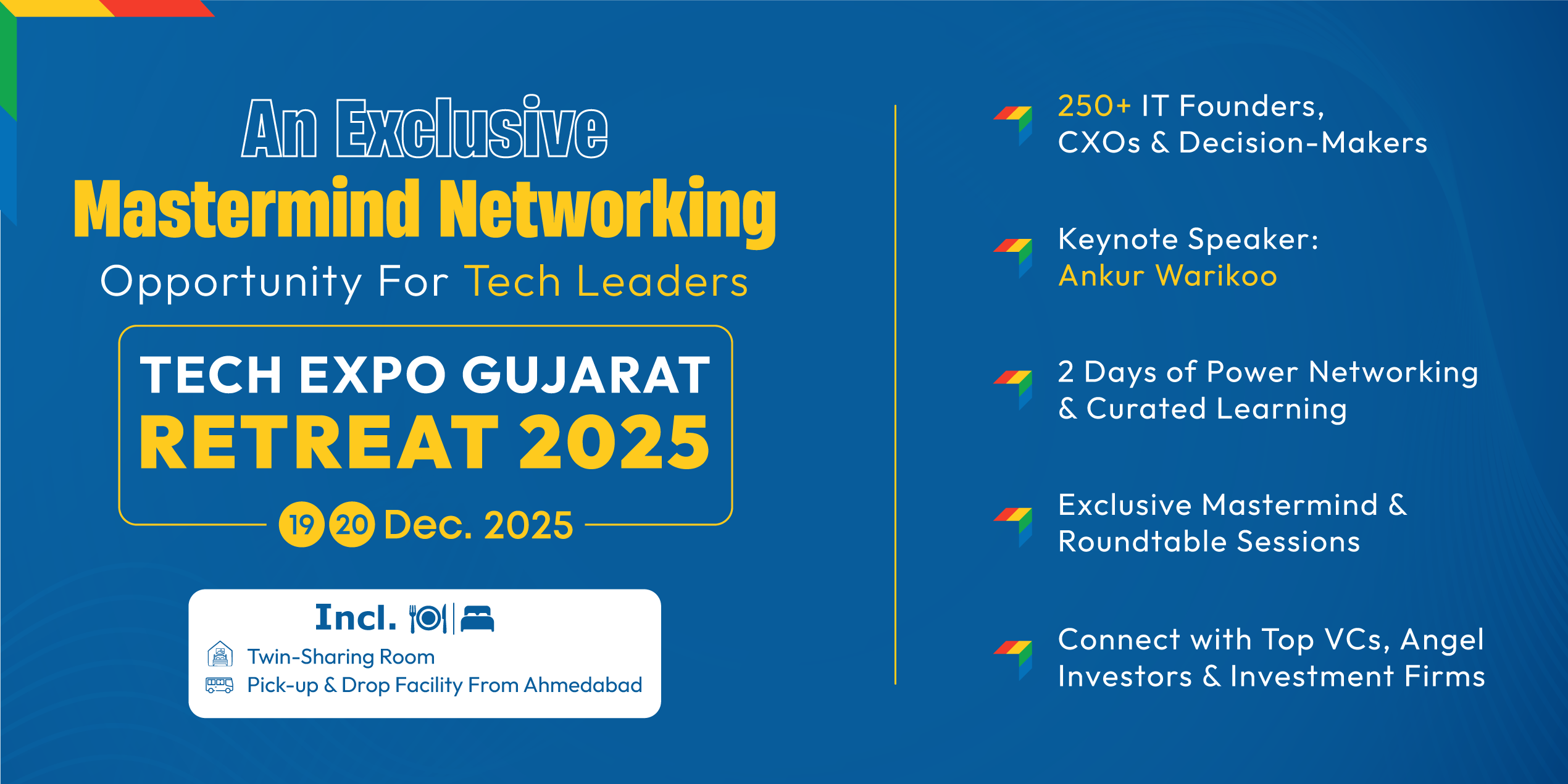 Choose your participation level for the most exclusive tech gathering in Gujarat. All packages include accommodation, meals, and networking opportunities. (Twin-sharing room, Pick-up and drop facility from Ahmedabad)